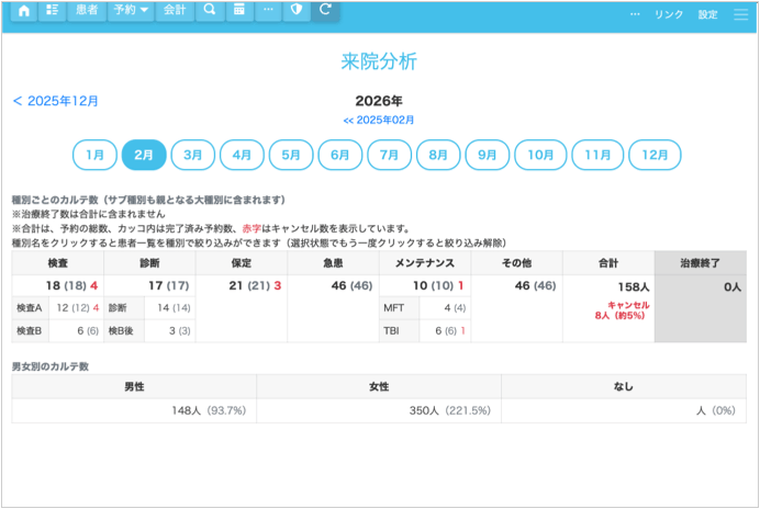 月別の来院した患者様の予約種別・キャンセル数・治療終了数など医院経営の分析にお役立て頂けます