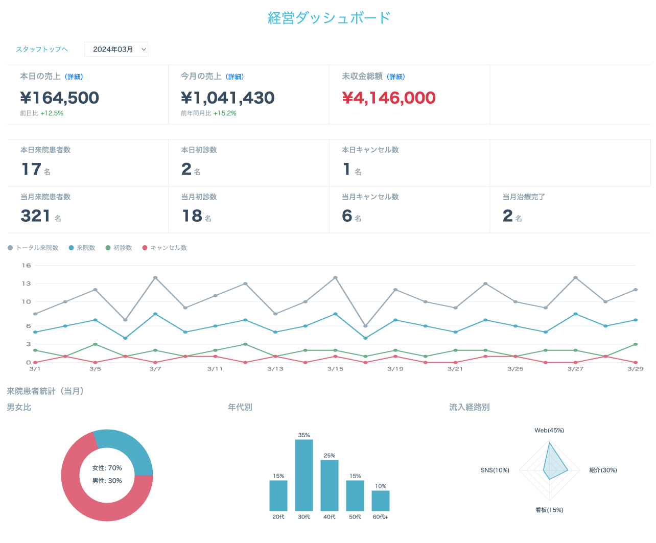 院内の数字、把握できていますか? そんな“いま”見るべき数字がすぐに分かるダッシュボード。来院状況、売上、未収金など、医院経営に必要な数字を1画面で把握できます。歯科コンサルの方との打ち合わせにもご活用ください。