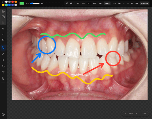 写真や画像への反転・回転・切り抜きはもちろん、線や矢印なども自由に書き込むことができます。iPadのペンでの手書きにも対応し、電子カルテでも手書きの良さが残せます。